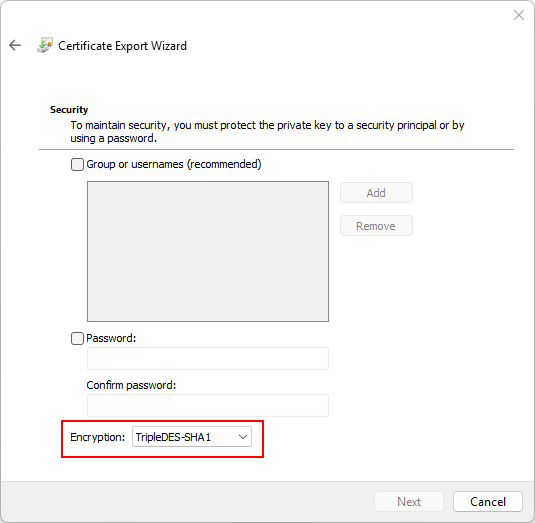 Set TripleDES-SHA1. A Password is also advised. You will need to remember it to input when you install the certificate on the old Operating System.