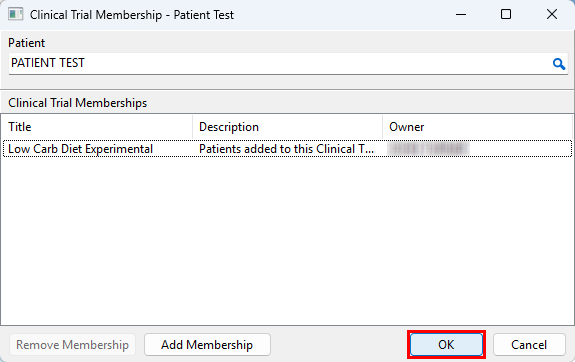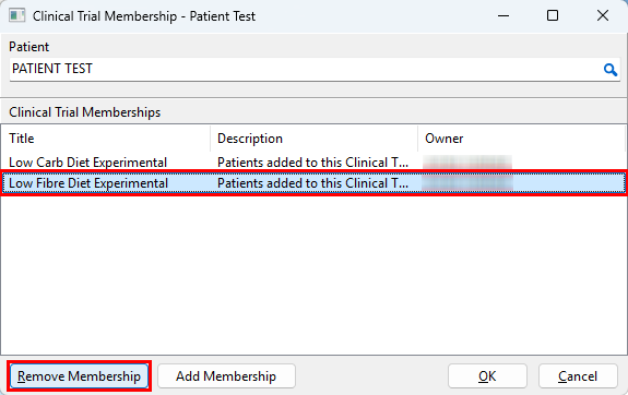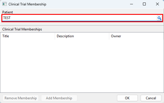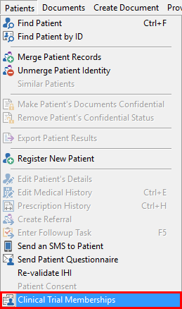 - To select a patient for Clinical Trial actions within Meridian, select Clinical Trial Memberships from the Patients menu to open the Clinical Trial Membership form.