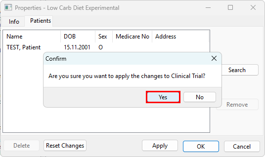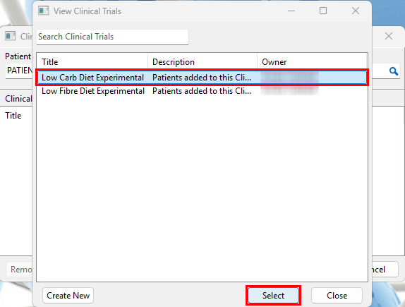 - Select the clinical trial the patient is deregistering from, then click OK.