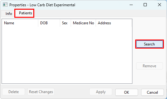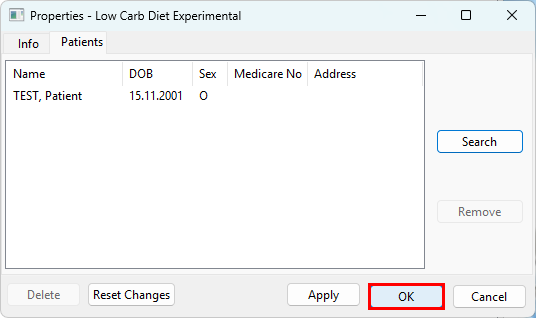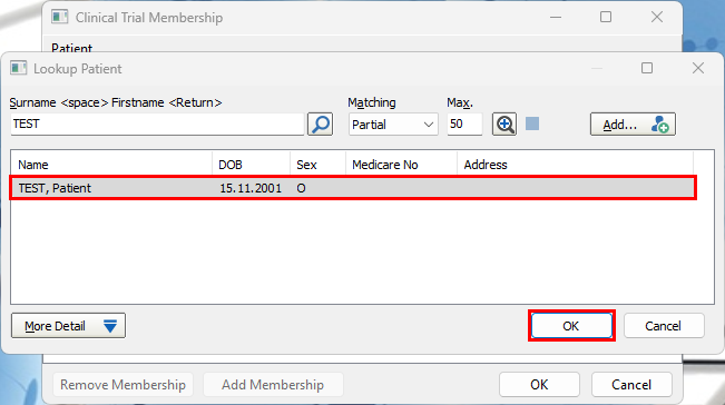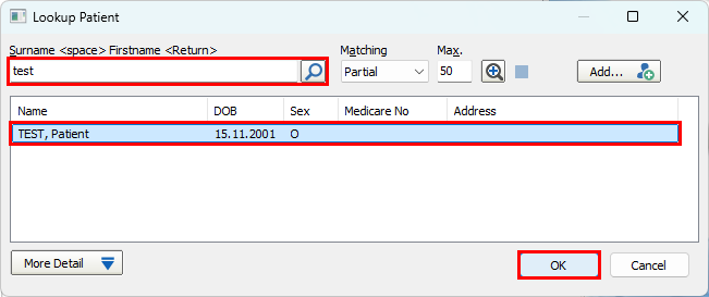- A list of patients will be listed from the patient lookup. Select a patient, then click OK.