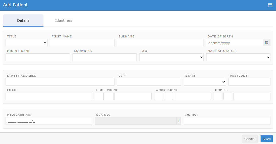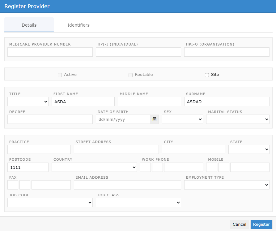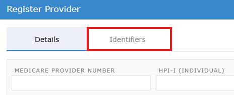 - This will open the provider register form, The required fields to save a provider record is, First Name, Surname and Postcode. While they are the only required fields, it's suggested that you fill as many of them out as possible, so you have as much information as possible on record. The identifiers tab will allow you to add a selection of additional identifiers to a provider.