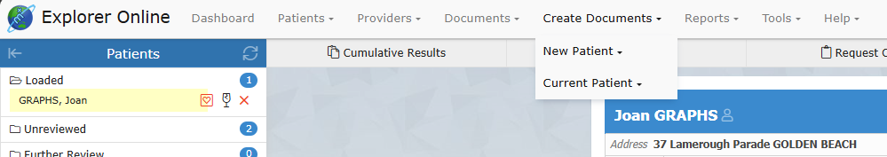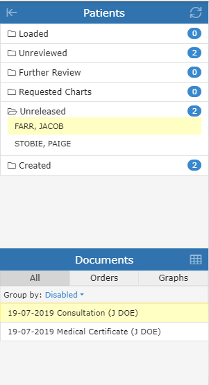 The Sidebar is a feature that allows you to access and manage your patient documents. The Sidebar is split into two sections: Patients and Documents. If you're using Explorer Online on a smaller screen you have the option to collapse the sidebar by clicking the collapse icon The Patients section of the Sidebar consists of individual folders which contains patient documents. The folders will list each unique patient that has a document for that folder. The count to the right is the amount of patients in the folder and not the amount of combined documents. Hovering over a folder will reveal a grid icon ( To refresh the contents of the folders simply click the refresh button ( Contains any patients you've done a lookup on or retrieved all documents for. You can remove a patient from this list by clicking the remove icon ( If you want to clear the folder and remove all patients you can click on the clear icon ( Contains patients that have unreviewed documents. Selecting documents from this folder will give you the option to mark the document as reviewed. A Max of 50 unreviewed documents will appear in the list initially. To load more results, scroll down on the table and the next 50 unreviewed documents will be added. You can scroll until 10,000 documents have been loaded. If you are still unable to find the result you are looking for, add filters by clicking the add filter button ( Contains patient documents that have been parked. A document can be parked by clicking the 'Park' document action button. Documents in this folder can only be accessed by the provider who made the original 'Park' request. To remove a document from this folder click the 'Unpark' document action button. Contains patient documents with the requested chart status. A document can be moved to the Requested Charts folder by clicking the 'Request Chart' document action button. Any user in your practice’s Explorer Online software, who has the granted permissions to view results, can access documents in this folder. For more information on setting user permissions, see our Explorer Online Admin Guide or please contact the Helpdesk on (07) 5456 6000. Practices can decide how to use this feature in their own workflows. For example, doctors can use this option as a request for staff to gather medical charts after receiving a message on a patient. Another example might be when a doctor receives an eReferral, and then clicks 'Request Chart' so that staff can be ready with the referral on hand prior to a consultation with a patient. Upon completion of the workflow relating to the document, staff can then select the 'Cancel Chart' document action button to remove it from the Requested Charts folder. Contains patient documents that have not yet been released. Documents in this folder can either be released or deleted. An unreleased document will have the following red text in the document title to indicate that it has not yet been released. Unreleased documents are created by ticking the 'For Approval Before Delivered' option when sending a document. Contains a recent list of documents that you have created, This includes both progress notes and documents that you have sent. You can clear this folder by hovering over it and clicking on the Clear Folder button ( The Documents section will list all the documents for the selected patient that correspond to the folder the patient is in. For example if you select a patient in the Unreviewed folder, all unreviewed documents for that patient will be listed. Hovering over the Documents section will reveal a grid icon ( Abnormal results will show as red in the documents list.Sidebar