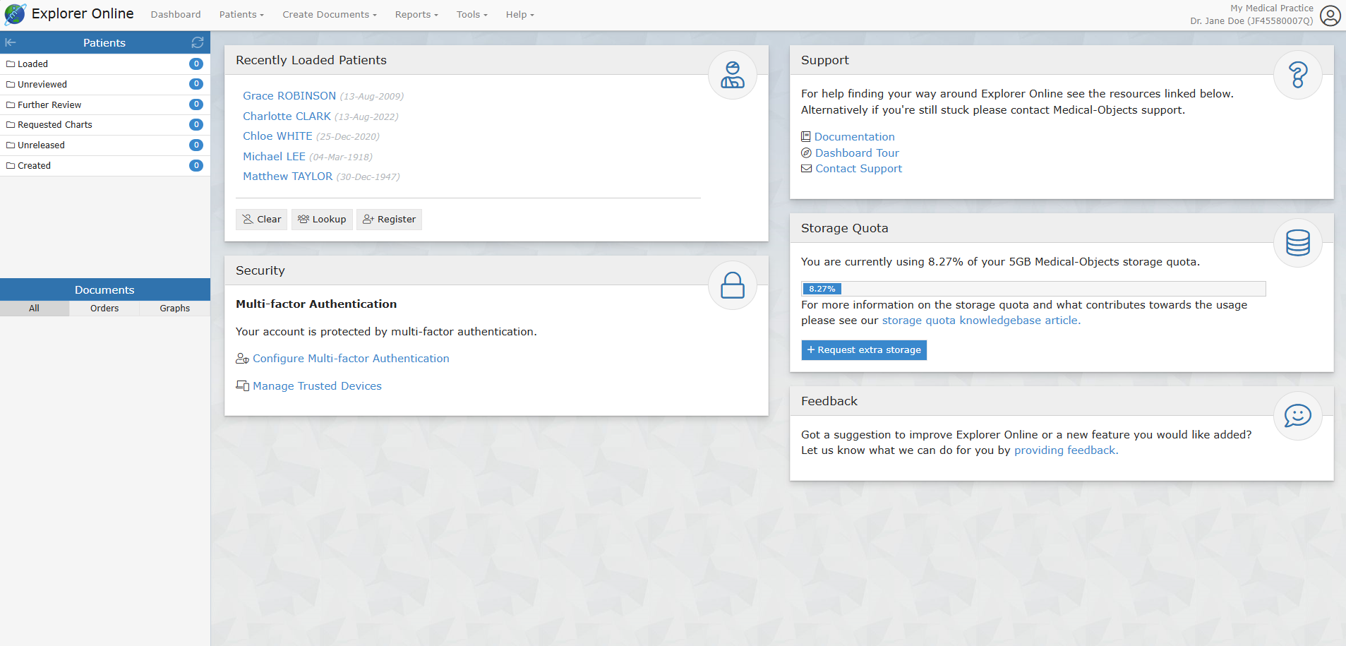 When first loading Explorer Online you will be presented with a login screen. Simply enter in your username and password and click login to proceed. Once logged in you can Logout again or Change Provider by simply clicking on the User Menu in the top right hand corner of the screen. Tip! You will be automatically logged out after 10 minutes of inactivity. You can change this via the User Settings option in the User Menu. Two-factor authentication is a security feature that helps protect your account in addition to your password. With two-factor authentication, a special login code together with your username and password will need to be entered each time someone tries to access your account from a computer or device that isn't recognised. In order to generate the special login codes, you will need to install a free app which supports the Time-based One-time Password Algorithm (TOTP) such as Google Authenticator, Authy and Microsoft Authenticator. There are many others, and some of these apps also support generating codes from desktop computers. To enable two-factor authentication can be enabled through the following steps. 1. Once you have logged in, Two-Factor Authentication can be enabled by clicking 'Enable Two-factor Authentication' on the 'Security' section in the Dashboard. 2. It will prompt you for your password 3. Decide whether you would like to set your device as a trusted device (this will allow you to skip these Two-Factor steps for 30 days on the selected device). Simply use the toggle button below “Trust this device” to select your choice, then select “Proceed”. 4. Open your Two-Factor Authentication app and scan the QR code provided (or enter the optional code), then click “Continue”. 5. Enter the code your app provided you, then select “Submit”. 6. Your Two-Factor Authentication is now setup – Click “Close”. 1. Locate the “Security” section on your Medical Objects dashboard, and select “Manage Trusted Devices”. 2. A list of trusted devices should display. Simply click “Remove” to delete a trusted device. Please note: Trusted devices will allow you to skip the Two-Factor steps for 30 days - once the 30 days expires they will show as a “Expired Trusted Device”. This means the next time you log into the portal on this device you will be prompted to enter the code you receive from your Two-Factor Authentication app. What is two-factor authentication? Two-factor authentication is a security feature that helps protect your account in addition to your password. With two-factor authentication, a special login code together with your username and password will need to be entered each time someone tries to access your account from a computer or device we don't recognise. What do I need to be able to use it? In order to generate the special login codes, you will need to install an app which supports the Time-based One-time Password Algorithm (TOTP) such as Google Authenticator, Authy, Microsoft Authenticator or Duo. There are many others, and some of these apps also support generating codes from desktop computers. Do I always need to enter a code when logging in? During login, you can choose not to use two-factor authentication again on that specific device by setting it as a ‘trusted device’. If you select this option, that device will only ask for your username and password when logging in for the next 30 days. You will still be protected, because when you or anyone else tries to sign in to your account from an unrecognised device, two-factor authentication will be required. Browser third party cookies need to be enabled for Explorer Online and two-factor authentication to operate correctly. They are usually enabled by default. You should not choose to trust a public device. How do I enable two-factor authentication? To enable two-factor authentication, you will need to use your app to scan a QR code generated by Explorer Online (or type in the code if you cannot scan it). Your app will then generate a confirmation code which you need to enter when prompted by Explorer Online. Your account will now be two-factor authentication enabled, and you will need to generate a code with your app whenever prompted by Explorer Online during login. Can this be made mandatory for everyone at the organisation? Two-factor authentication can be made mandatory for all users. This will force each account on login to enable two-factor authentication (if it is not already enabled). Please contact our helpdesk (helpdesk@medicalobjects.com) if you would like this enabled. How to reset two-factor authentication? If you have lost your device or app which was used to enable two-factor authentication, email helpdesk@medicalobjects.com for assistance. The Dashboard is the default page that will appear once you have logged into Explorer Online. The Dashboard is split into three sections: Navigation Menu, Sidebar and the main content area. This is the main navigation menu. The menu is dynamically built up based on what features your server has enabled and what permissions your user account has. If a menu item is missing you may need to call the Helpdesk to correct your user permissions or enable a server feature. The User Menu is the menu in the top right-hand corner. This will display the server you've logged into and also which provider you selected at login. When you click on the User Menu a drop down will appear with menu options related to your user account. Warning Please contact us to enable this feature on your account. To ensure you are always up to date with the latest unreviewed results, Explorer Online will continuously poll for new results (every 5 minutes by default). This setting can be changed be changed by:Logging in and out