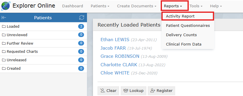 To register a patient, select the Patients button in the top navigation and then click Register Patient on the dropdown.