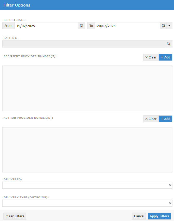The Activity Report allows you to view the transaction history of both incoming and outgoing documents. You can access the Activity Report via the Reports top menu option. When selecting the Activity Report menu option you will be presented with a window listing the report filtering options available. These will help you narrow the report down to only the documents you're interested in. By default, the filter options will show the current daily activity. You can leave it at that or you can click on the drop down button next to the end date to select a pre-defined range. Tips The status of the document. The most common are; This is a timestamp for when the document was delivered. It does not necessarily mean that the document has been viewed or reviewed - only that it has been delivered. If this field is blank then the document has not been delivered. This column allows you to know whether or not the document has been acknowledged. To see what each icon in this column means; refer to the ACK Legend that can be found in the top right. Hover your mouse over each icon for a description. You can view a single document by clicking on the view document icon ( From this window you can perform various actions on the single document such as print, forward or loading the patient file via the All Documents button. You can also navigate to other documents via the back ( You can select multiple documents in the grid and then perform an action on the selection. Currently the bulk actions available are;
