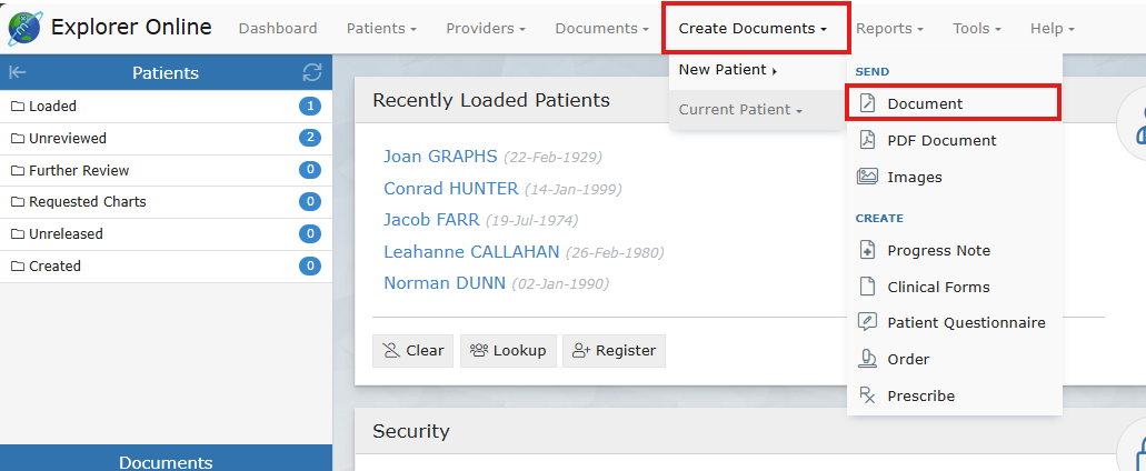 To send a document, you can click the Create Documents → New Patient (or Current Patient) → Document (Under Send) in the navigation bar at the top.