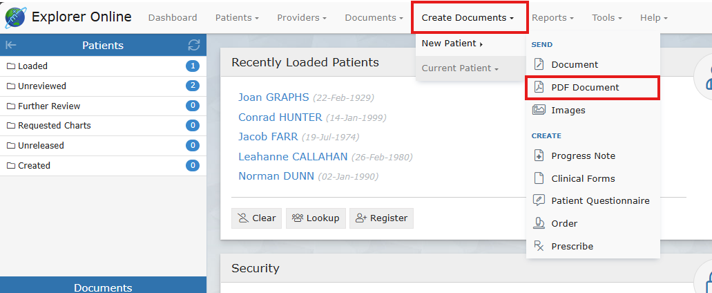 To send a PDF document, you can click the Create Documents → New Patient (or Current Patient) → PDF Document (Under Send) in the navigation bar at the top.
