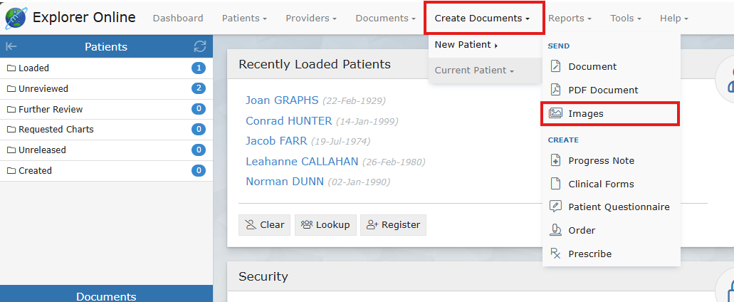 To send images you can click the Create Documents → New Patient (or Current Patient) → Images (Under Send) in the navigation bar at the top.