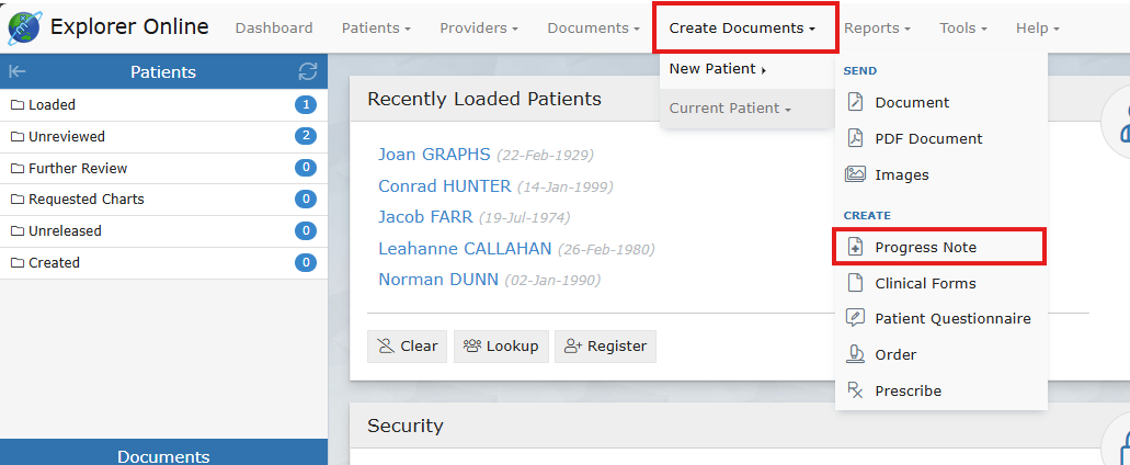 A Progress Note is an internal document for a patient that is stored against the patient's file. You can create a Progress Note for a patient from the Create Documents → New Patient (or Current Patient) menu in the top navigation.