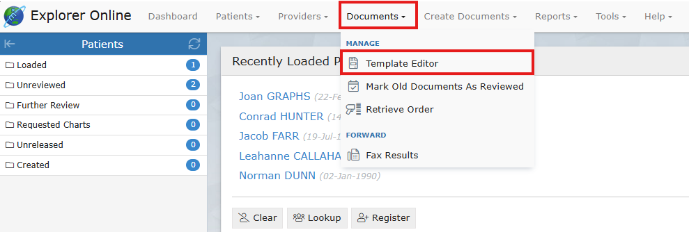 To get to the Document Template Editor, you can click Documents → Template Editor (Under manage). A screen should show up with text editors, and a sidebar.