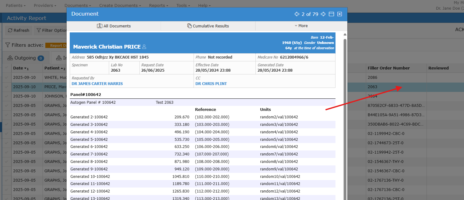 Tips Adds the document to the Requested Charts sidebar folder. To list documents in a grid allowing for bulk actions you can simply click on the grid icon ( Tips You can click on the document icon ( You can apply filters to the grid to help you better find results you are looking for. In order to apply filters, click on add filter button ( Once you have added your desired filters and clicked apply filters, The grid will refresh, clearing existing data and displaying only the filtered results. When the unreviewed results grid first opens, it displays 50 rows sorted by received date. To load more results, simply scroll down. As you approach 25 rows from the bottom, an additional 50 results will be automatically loaded while maintaining the existing order. You can load up to 10,000 results into the grid by scrolling. Once this limit is reached, further results will be blocked, and you’ll be prompted to apply filters for more precise access to the data you need. Clicking on patient in the unreviewed folder will attempt to lazily load any additional unreviewed results for that patient from the server. You can select multiple documents in the grid and then perform an action on the selection. Currently the bulk actions available are: Documents that appear in your Unreviewed sidebar folder will need reviewing so that the sender of the document receives an acknowledgement. Marking a document as reviewed can be done one of two ways. Both methods will only be accessible if you're viewing the document from within the Unreviewed sidebar folder. Note: If you're viewing a document in windowed mode and use the spacebar to scroll to the bottom and mark it as reviewed, you'll be taken to the next document in the background grid.Viewing Documents