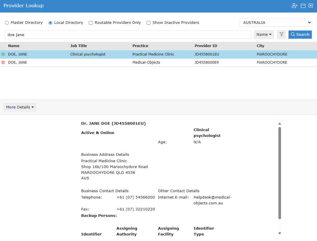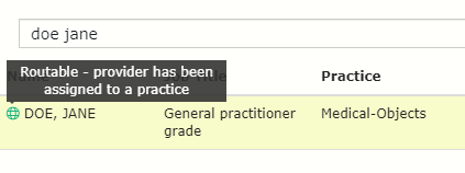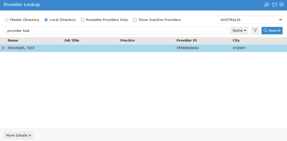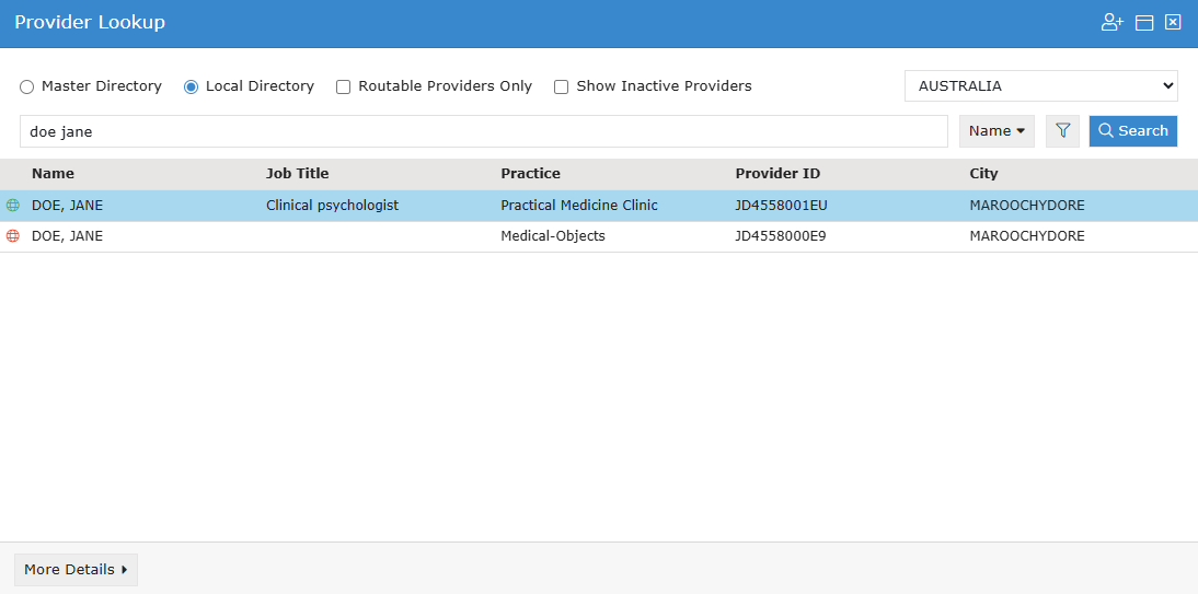 2. Enter the details of the provider in the search box, enter the surname first if you are searching by the Name search type. Press the Search button or hit the enter key to load results. 3. You can check to see if the provider number is routable by looking for the green globe in the Name column. 4. By pressing the More Details button (
