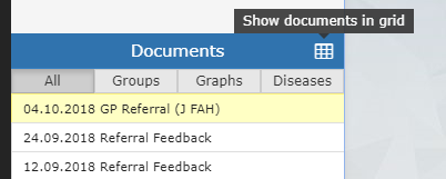 Park Adds the document to the Further Review sidebar folder. Unpark Removes the document from the Further Review sidebar folder. Request Chart Cancel Chart Removes the document from the Requested Charts sidebar folder. Create Response Brings up the Send Document form with the patient, ordering provider and copies to fields pre-populated from the document. History Loads the transaction history of the document. Forward Allows you to forward the document to another provider. Print Allows you to print the document. Release This button is only visible for unreleased documents. It will release the document and send it to the addressed provider/s. Delete This button is only visible for unreleased documents. It will delete the unreleased document. Mark as Reviewed This button is only visible when viewing a document from within the Unreviewed sidebar folder. It will mark the document as reviewed. All Documents This button will show up when viewing a document from any sidebar folder except the Loaded Patients folder. When clicked it will load all the documents for the patient of the currently selected document. Cumulative Results Loads a table of the patients cumulative results. You can view these cumulative results in a visual chart. Viewing documents in grid