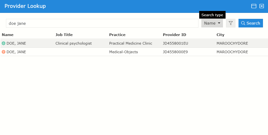 The Provider Lookup feature allows you to easily search details and check if a provider is routable (setup to receive sent results). 2. Enter the details of the provider in the search box, enter the surname first if you are searching by the Name search type. Press the Search button or hit the enter key to load results. 3. You can check to see if the provider number is routable by looking for the green globe in the Name column.
