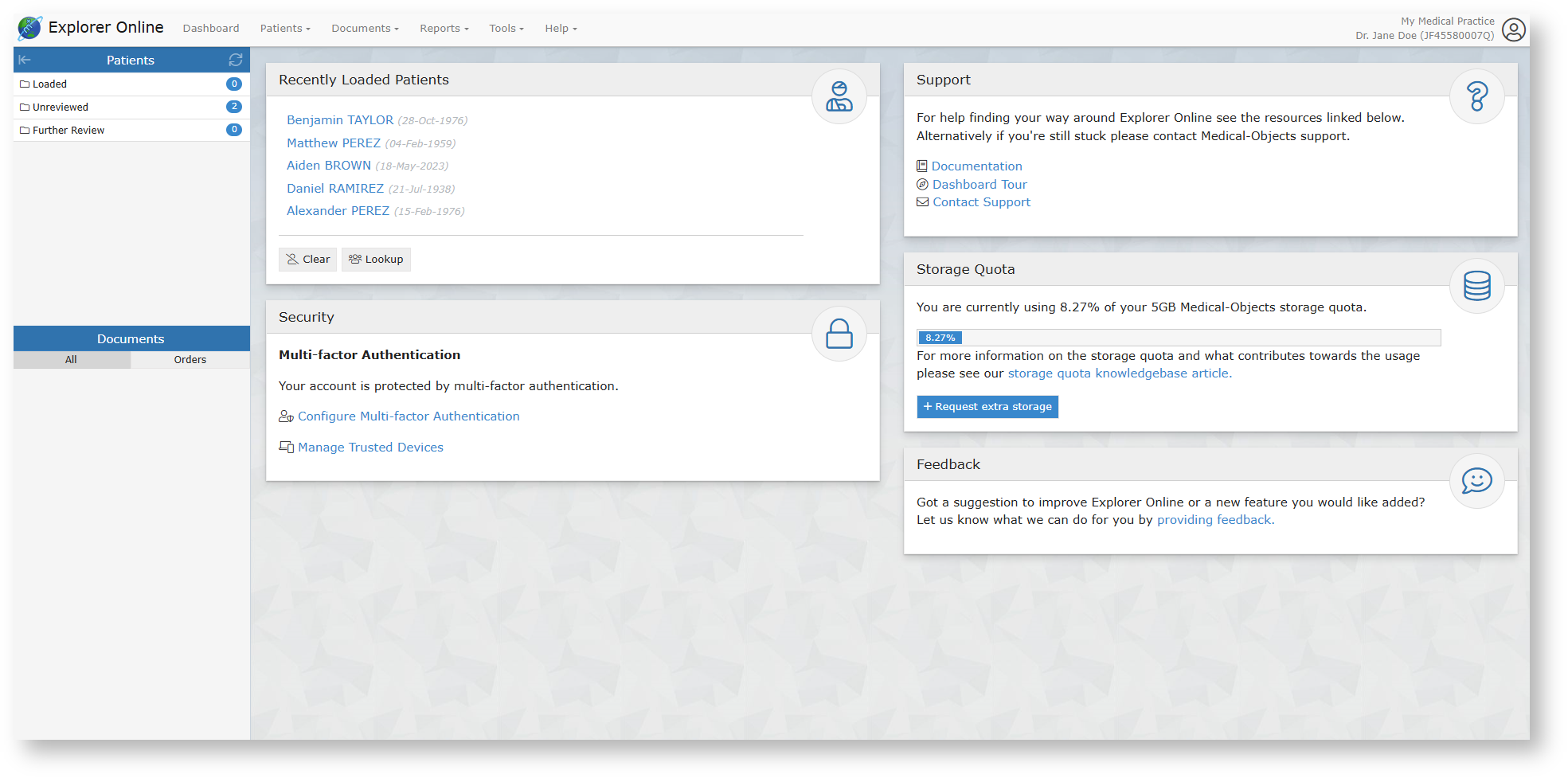When first loading Explorer Online you will be presented with a login screen. Simply enter in your username and password and click login to proceed. Once logged in you can Logout again or Change Provider by simply clicking on the User Menu in the top right hand corner of the screen. Tip! You will be automatically logged out after 10 minutes of inactivity. You can change this via the User Settings option in the User Menu. Two-factor authentication is a security feature that helps protect your account in addition to your password. With two-factor authentication, a special login code together with your username and password will need to be entered each time someone tries to access your account from a computer or device that isn't recognised. In order to generate the special login codes, you will need to install a free app which supports the Time-based One-time Password Algorithm (TOTP) such as Google Authenticator, Authy and Microsoft Authenticator. There are many others, and some of these apps also support generating codes from desktop computers. To enable two-factor authentication can be enabled through the following steps. 1. Once you have logged in, Two-Factor Authentication can be enabled by clicking 'Enable Two-factor Authentication' on the 'Security' section in the Dashboard. 2. It will prompt you for your password 3. Decide whether you would like to set your device as a trusted device (this will allow you to skip these Two-Factor steps for 30 days on the selected device). Simply use the toggle button below “Trust this device” to select your choice, then select “Proceed”. 4. Open your Two-Factor Authentication app and scan the QR code provided (or enter the optional code), then click “Continue”. 5. Enter the code your app provided you, then select “Submit”. 6. Your Two-Factor Authentication is now setup – Click “Close”. 1. Locate the “Security” section on your Medical Objects dashboard, and select “Manage Trusted Devices”. 2. A list of trusted devices should display. Simply click “Remove” to delete a trusted device. Please note: Trusted devices will allow you to skip the Two-Factor steps for 30 days - once the 30 days expires they will show as a “Expired Trusted Device”. This means the next time you log into the portal on this device you will be prompted to enter the code you receive from your Two-Factor Authentication app. What is two-factor authentication? Two-factor authentication is a security feature that helps protect your account in addition to your password. With two-factor authentication, a special login code together with your username and password will need to be entered each time someone tries to access your account from a computer or device we don't recognise. What do I need to be able to use it? In order to generate the special login codes, you will need to install an app which supports the Time-based One-time Password Algorithm (TOTP) such as Google Authenticator, Authy, Microsoft Authenticator or Duo. There are many others, and some of these apps also support generating codes from desktop computers. Do I always need to enter a code when logging in? During login, you can choose not to use two-factor authentication again on that specific device by setting it as a ‘trusted device’. If you select this option, that device will only ask for your username and password when logging in for the next 30 days. You will still be protected, because when you or anyone else tries to sign in to your account from an unrecognised device, two-factor authentication will be required. Browser third party cookies need to be enabled for Explorer Online and two-factor authentication to operate correctly. They are usually enabled by default. You should not choose to trust a public device. How do I enable two-factor authentication? To enable two-factor authentication, you will need to use your app to scan a QR code generated by Explorer Online (or type in the code if you cannot scan it). Your app will then generate a confirmation code which you need to enter when prompted by Explorer Online. Your account will now be two-factor authentication enabled, and you will need to generate a code with your app whenever prompted by Explorer Online during login. Can this be made mandatory for everyone at the organisation? Two-factor authentication can be made mandatory for all users. This will force each account on login to enable two-factor authentication (if it is not already enabled). Please contact our helpdesk (helpdesk@medicalobjects.com) if you would like this enabled. How to reset two-factor authentication? If you have lost your device or app which was used to enable two-factor authentication, email helpdesk@medicalobjects.com for assistance.Logging in and out