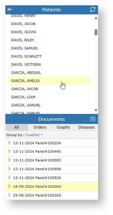 The Documents section will list all the documents for the selected patient that correspond to the folder the patient is in. For example if you select a patient in the Unreviewed folder, all unreviewed documents for that patient will be listed.