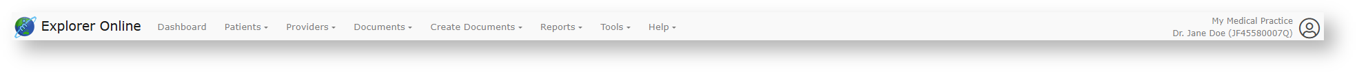 This is the main navigation menu. The menu is dynamically built up based on what features your server has enabled and what permissions your user account has. If a menu item is missing you may need to call the Helpdesk to correct your user permissions or enable a server feature. User MenuThe User Menu is the menu in the top right-hand corner. This will display the server you've logged into and also which provider you selected at login. When you click on the User Menu a drop down will appear with menu options related to your user account.