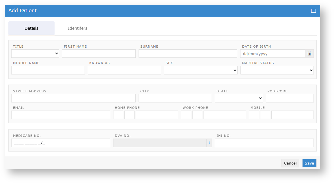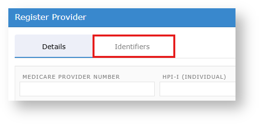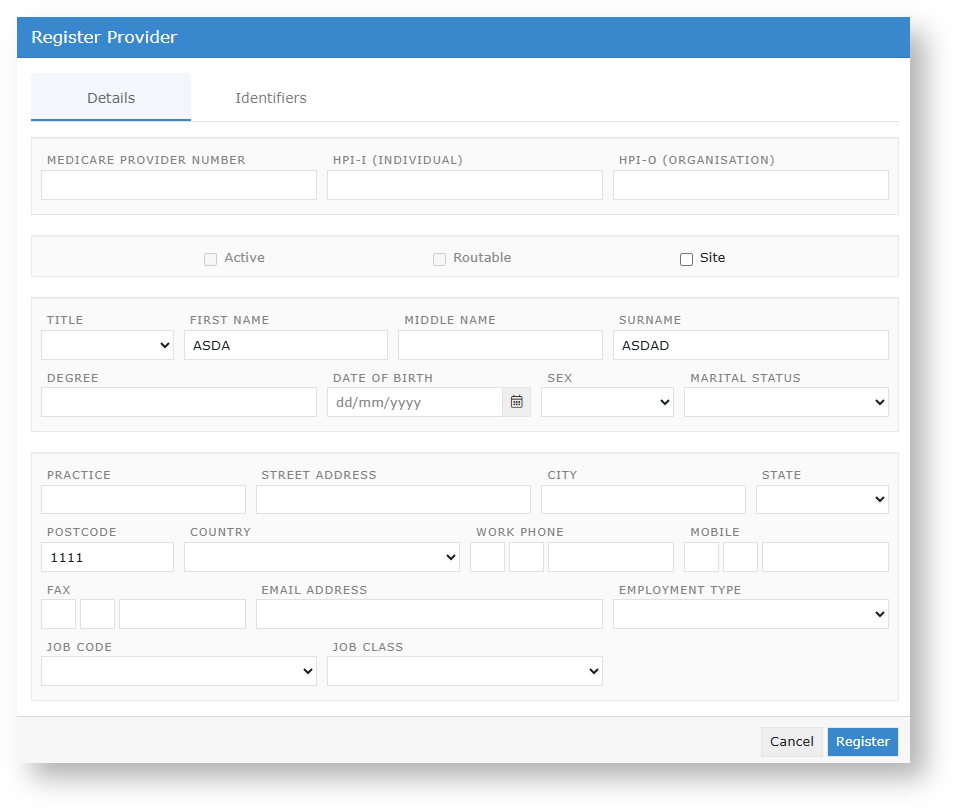Image Added - This will open the provider register form, The required fields to save a provider record is, First Name, Surname and Postcode. While they are the only required fields, it's suggested that you fill as many of them out as possible, so you have as much information as possible on record. The identifiers tab will allow you to add a selection of additional identifiers to a provider.