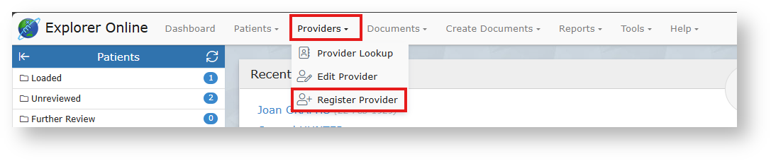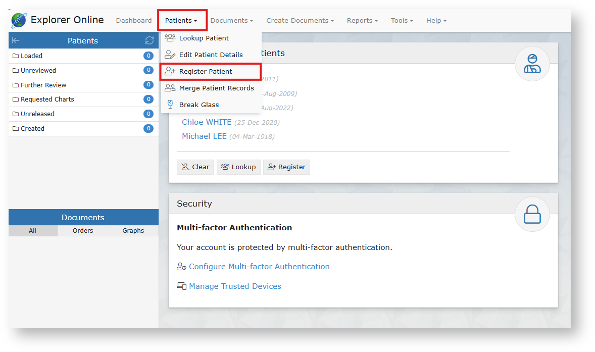 To register a patient, select the Patients button in the top navigation and then click Register Patient on the dropdown.