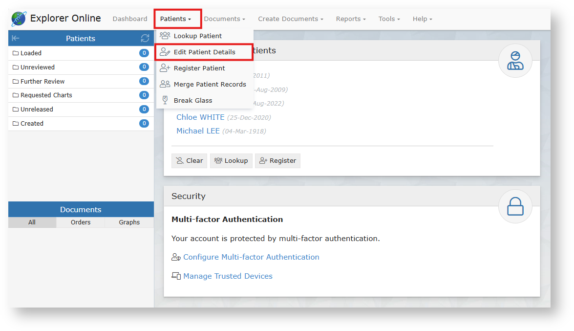 To edit a patient, go to the Patients dropdown in the top navigation bar, and then click Edit Patient Details.