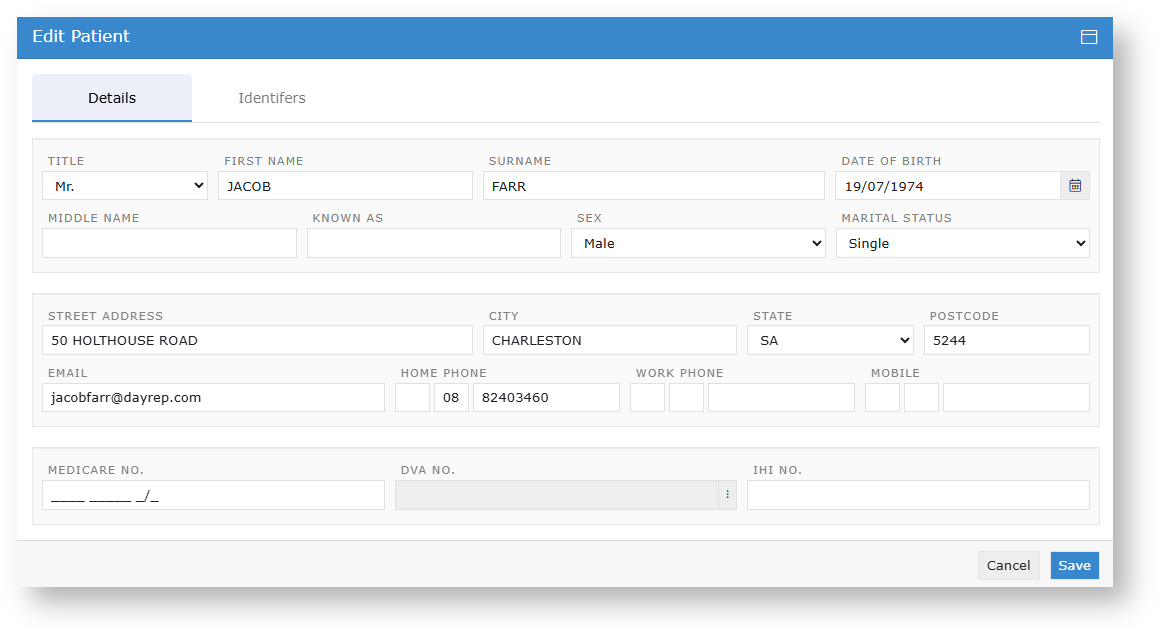 Once you have found your patient, you can then select the patient you wish to view, and then you will see the edit screen. Fill out the fields that you wish to change or add, and then click the Save button.