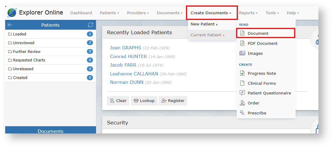 To send a document, you can click the Documents → Document the Create Documents → New Patient (or Current Patient) → Document (Under Send) in the navigation bar at the top.