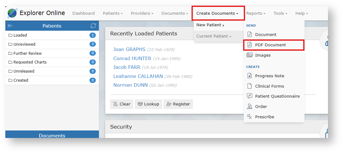 To send a PDF document, you can click the Documents → PDF Document Create Documents → New Patient (or Current Patient) → PDF Document (Under Send) in the navigation bar at the top.