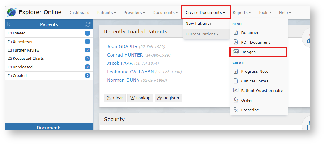 To send images you can click the Documents → Create Documents → New Patient (or Current Patient) → Images (Under Send) in the navigation bar at the top.
