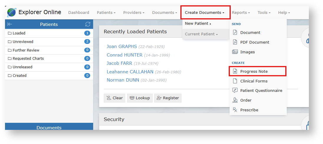 create a Progress Note for a patient from the Create Documents → New Patient (or Current Patient) menu in the top navigation.