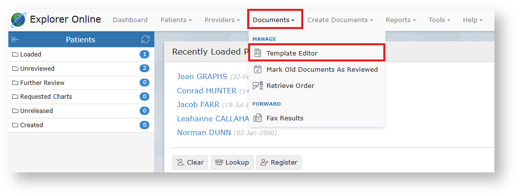 To get to the Document Template Editor, you can click Documents → Template Editor (Under manage). A screen should show up with text editors, and a sidebar.