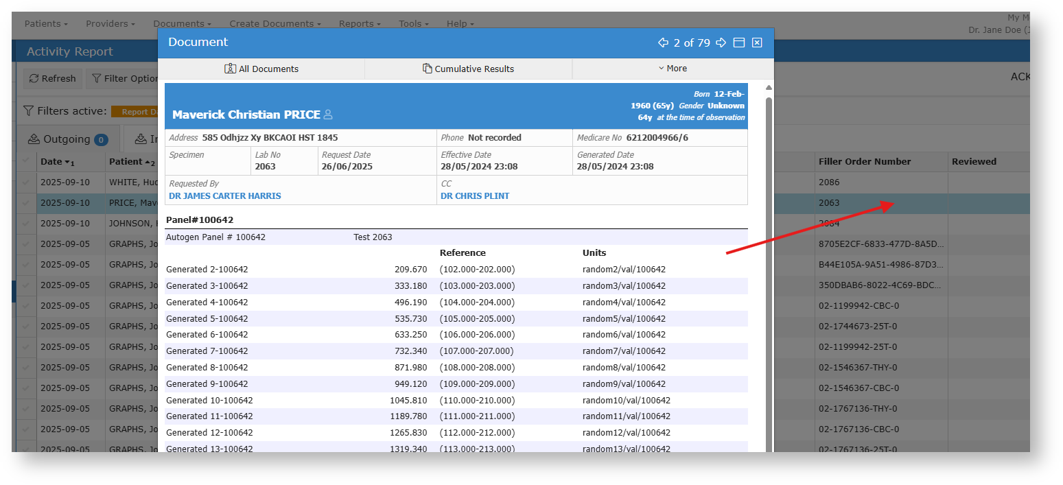 DocumentsThe Documents section will list all the documents for the selected patient that correspond to the folder the patient is in. For example if you select a patient in the Unreviewed folder, all unreviewed documents for that patient will be listed. Hovering over the Documents section will reveal a grid icon ( Abnormal results will show as red in the documents list. |