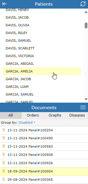 The Documents section will list all the documents for the selected patient that correspond to the folder the patient is in. For example if you select a patient in the Unreviewed folder, all unreviewed documents for that patient will be listed.